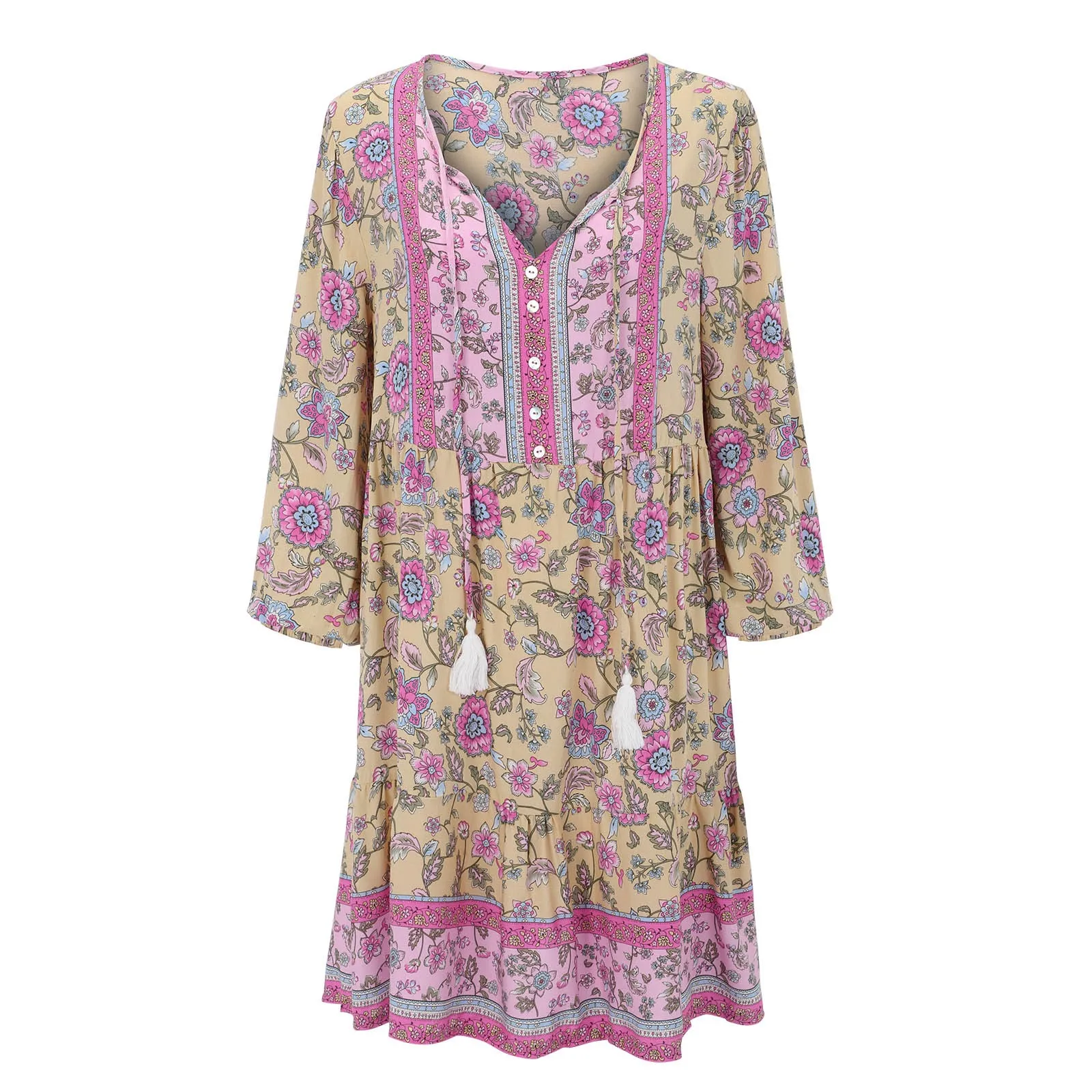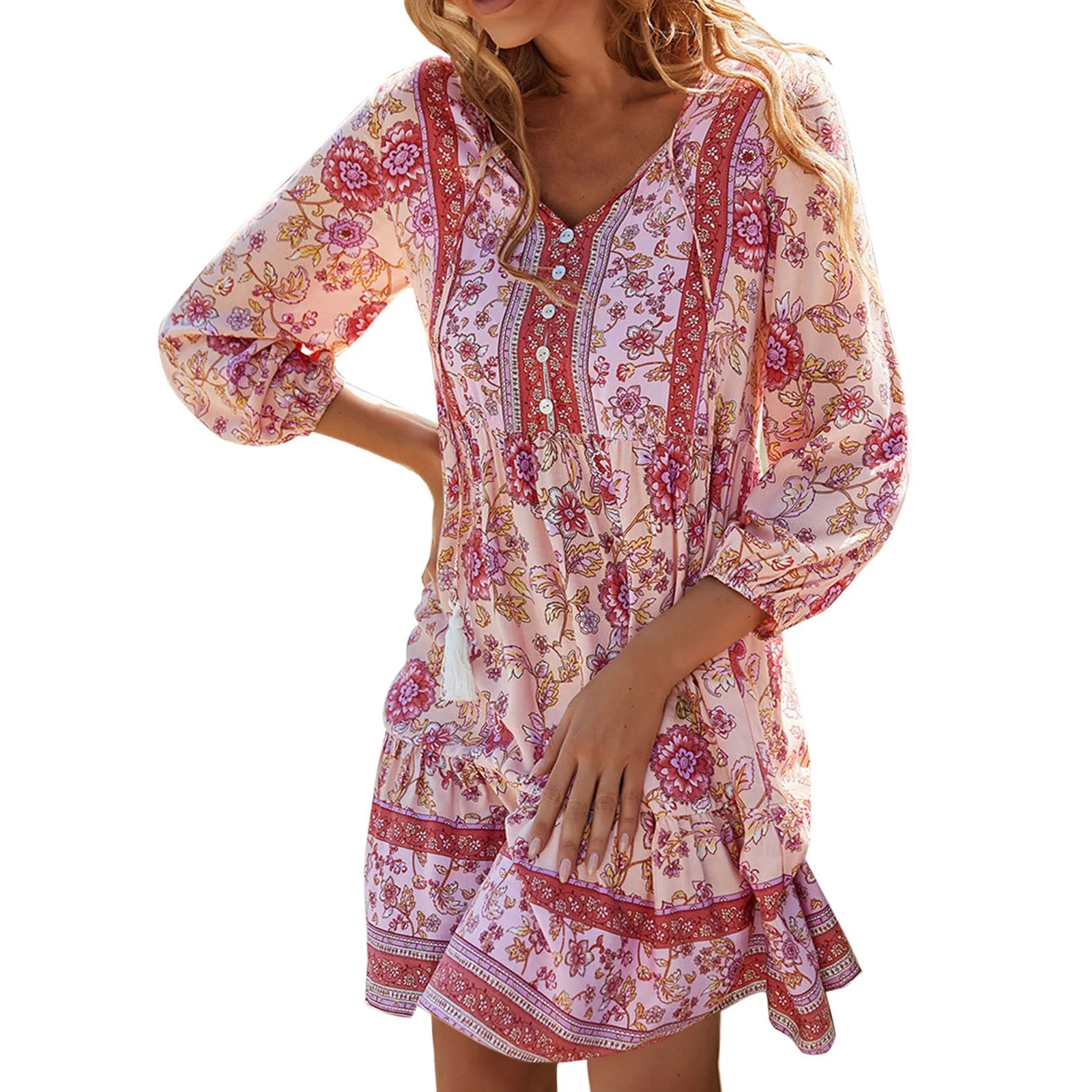 Women'S V Neck Lace Up Button Bohemian Casual Resort Style Dress Short Dress