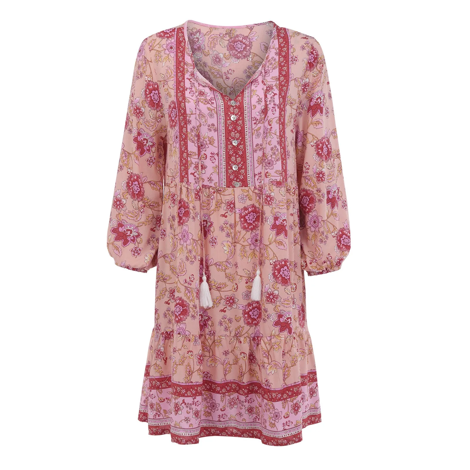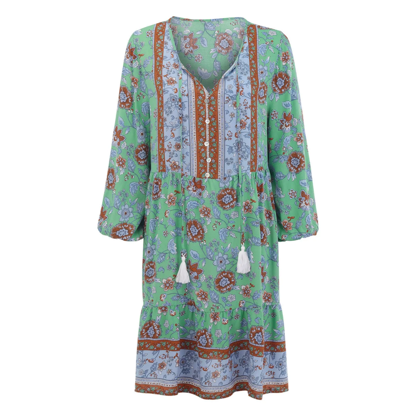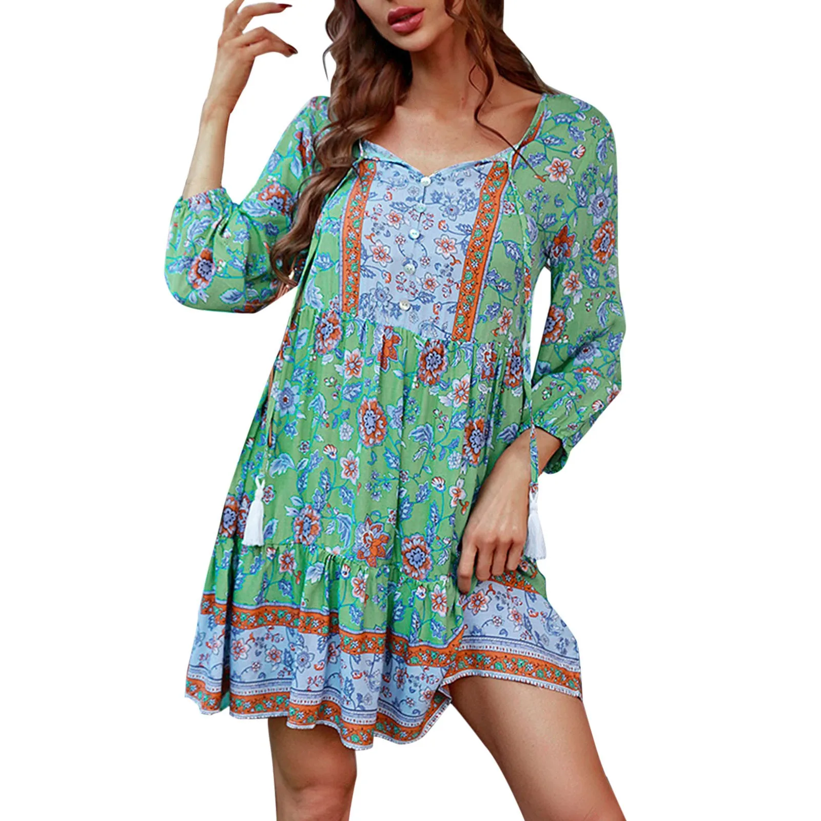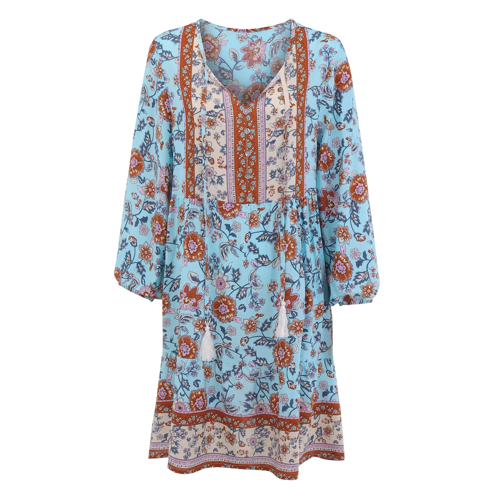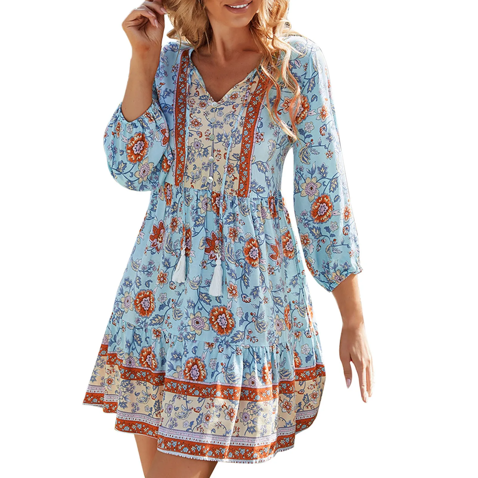 Features: seven-point balloon sleeves, V-neck, lace-up, bohemian style, pretty print, loose waist, smooth A-line hem, short length. Summer bohemian casual beach dress mini skirt.
