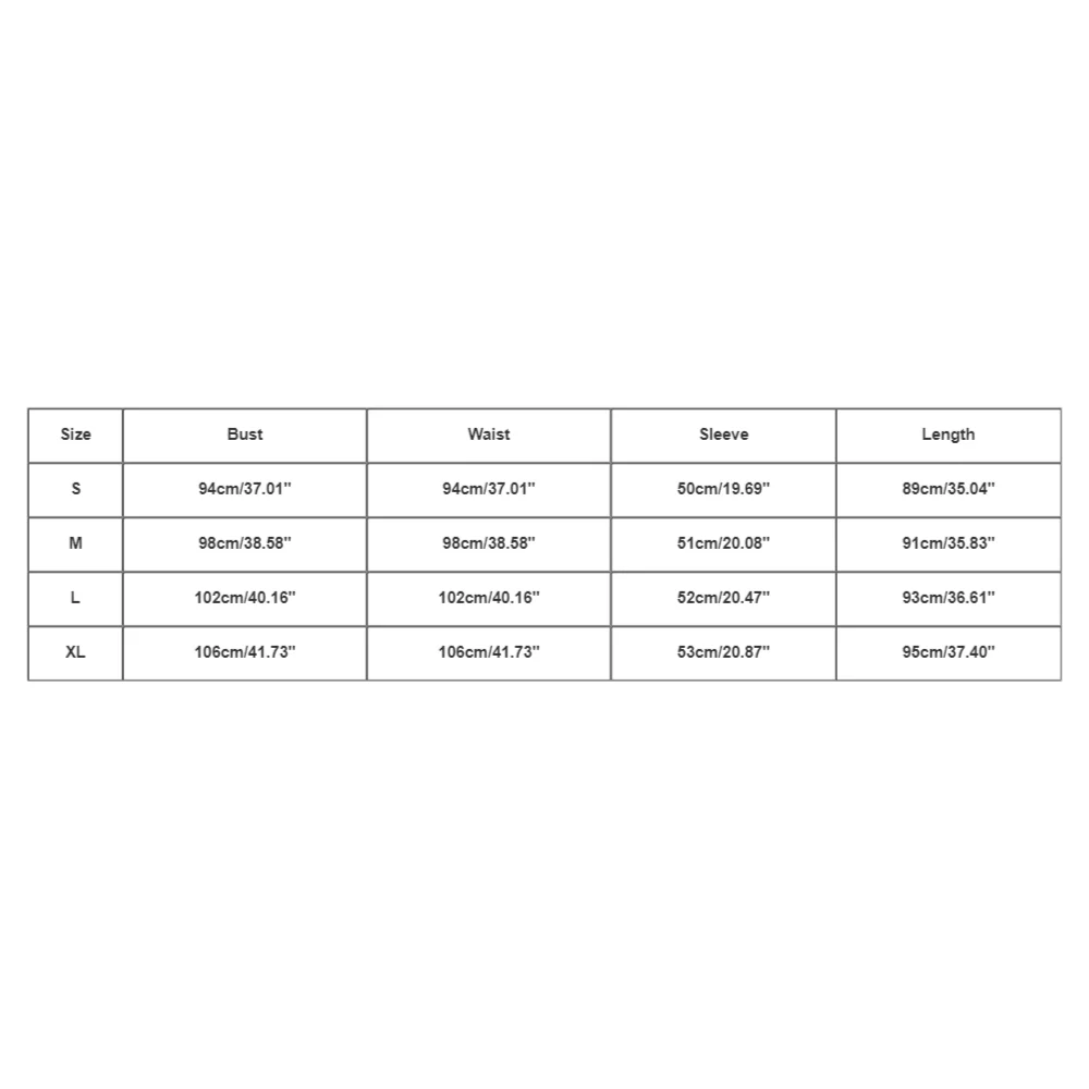| Size:S | Bust:94cm/37.01'' | Waist:94cm/37.01'' | Sleeve:50cm/19.69'' | Length:89cm/35.04'' |