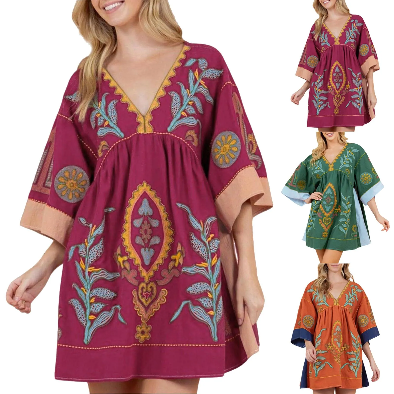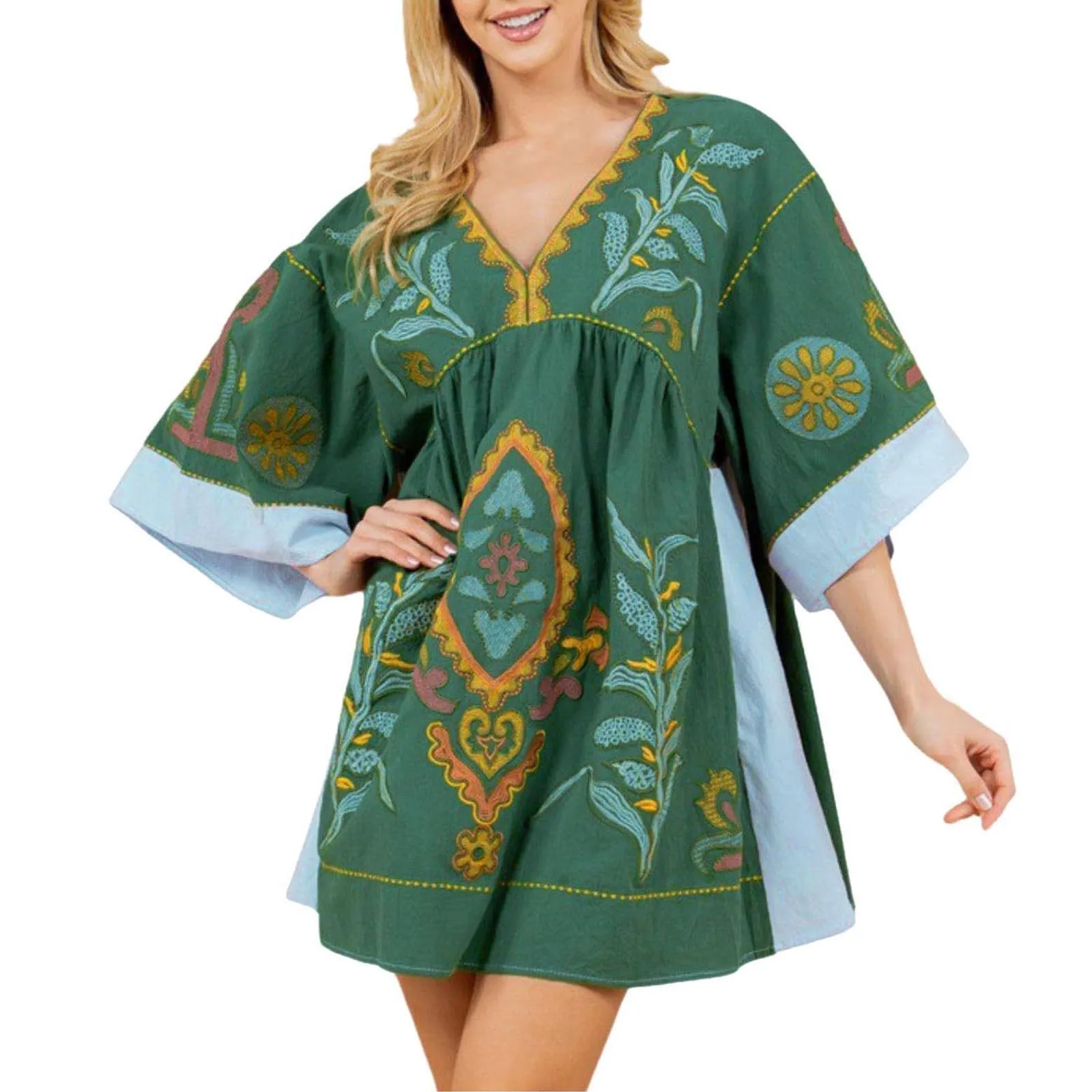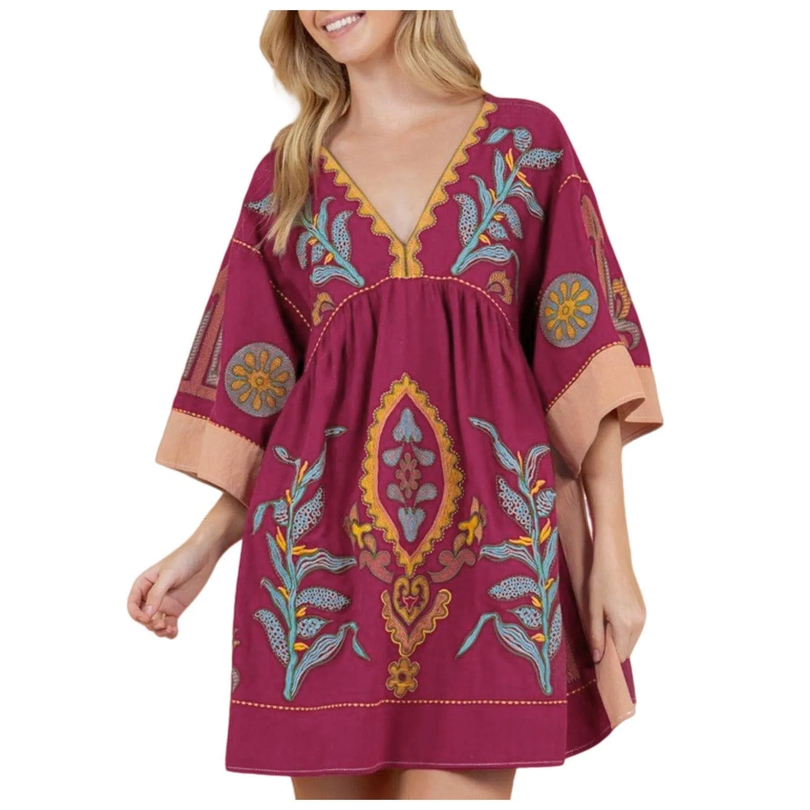 Women Casual Embroidered Dress V Neck 3/4 Sleeve Loose Retro Embroidered Mini Dress