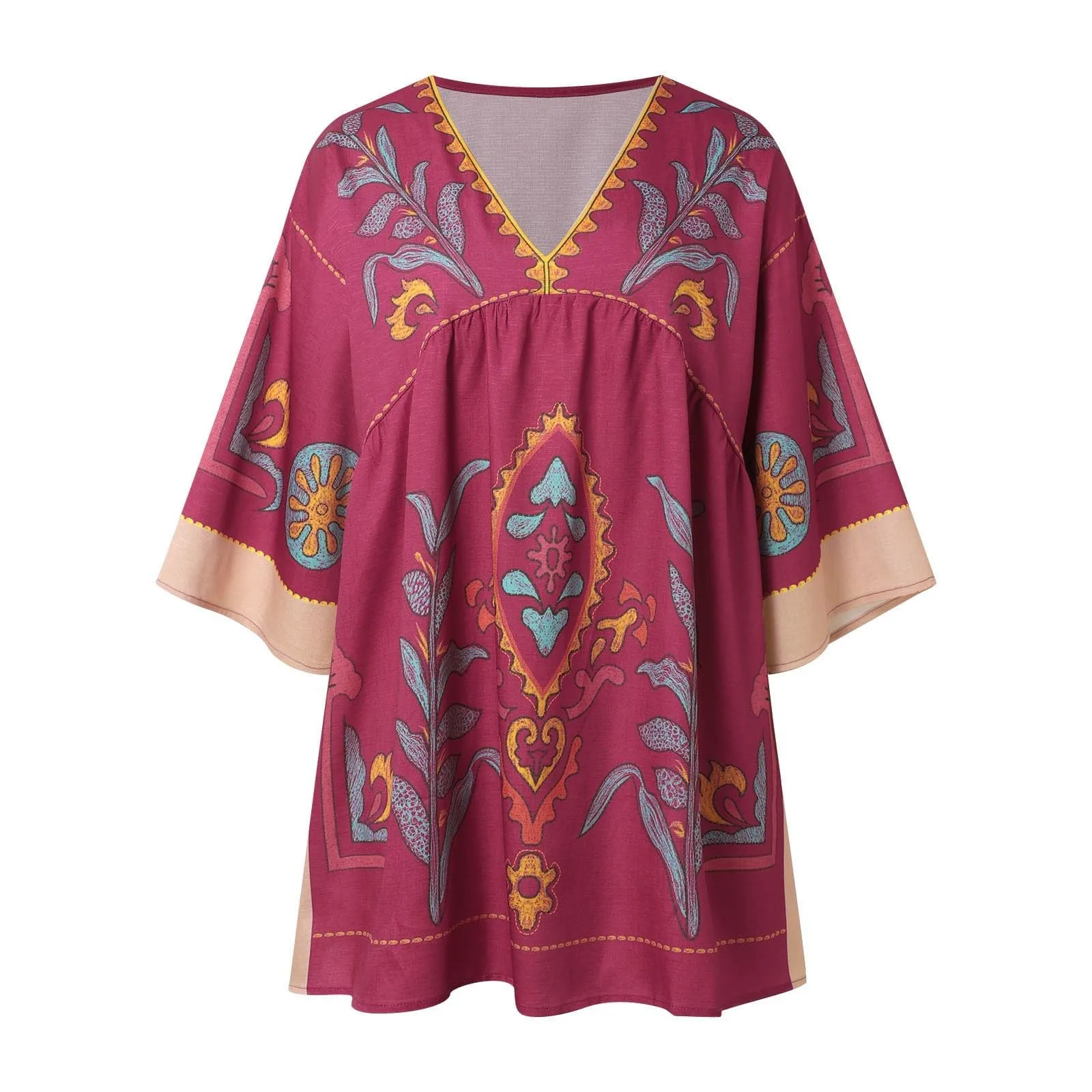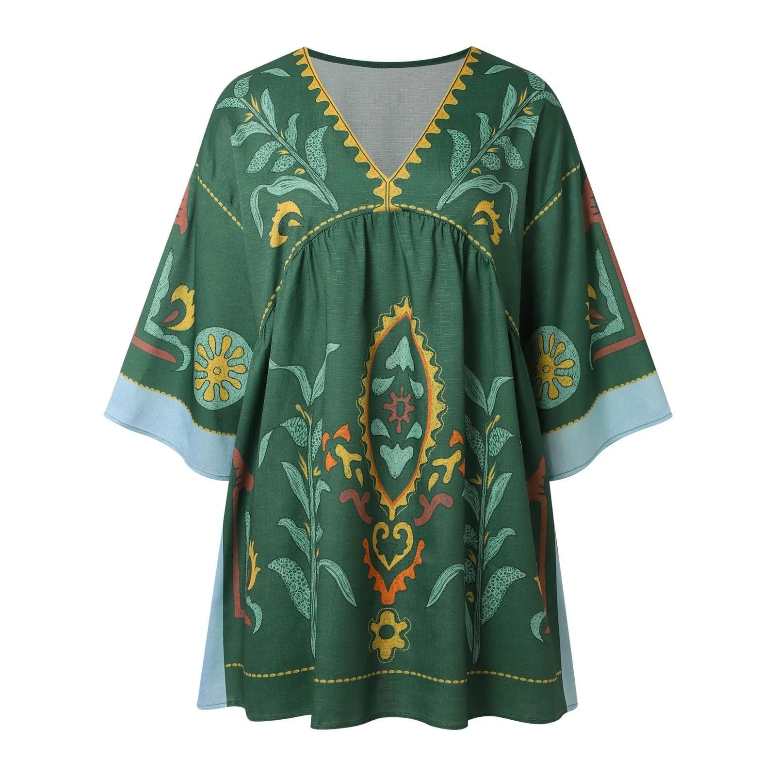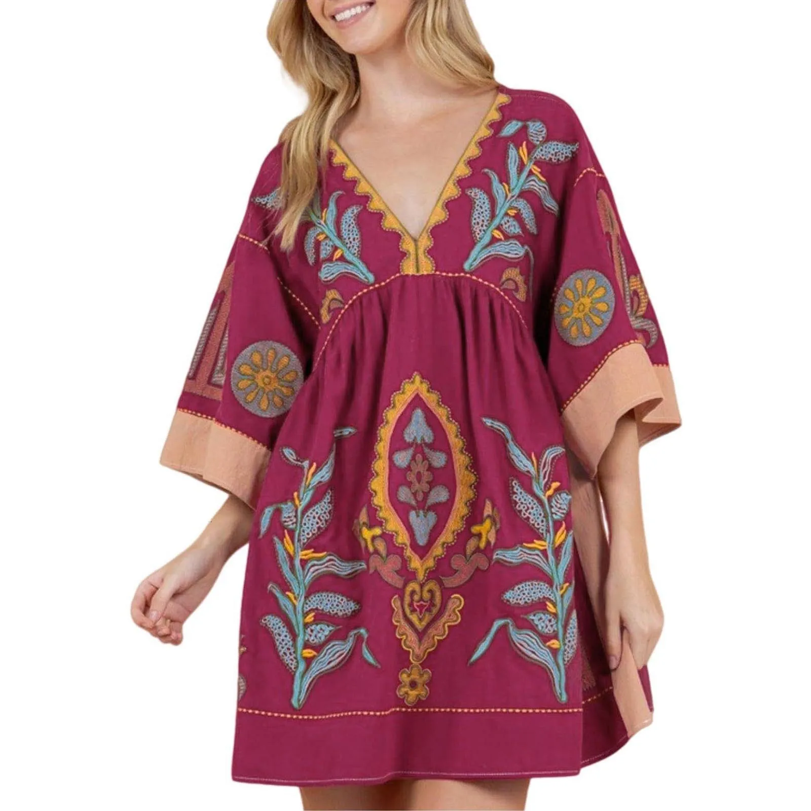 Women Casual Embroidered Dress V Neck 3/4 Sleeve Loose Retro Embroidered Mini Dress