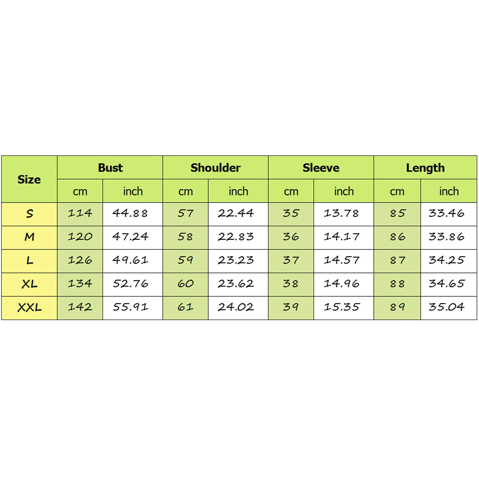 | Size:XXL | Bust:142cm/55.91'' | Shoulder:61cm/24.02'' | Sleeve:39cm/15.35'' | Length:89cm/35.04'' |