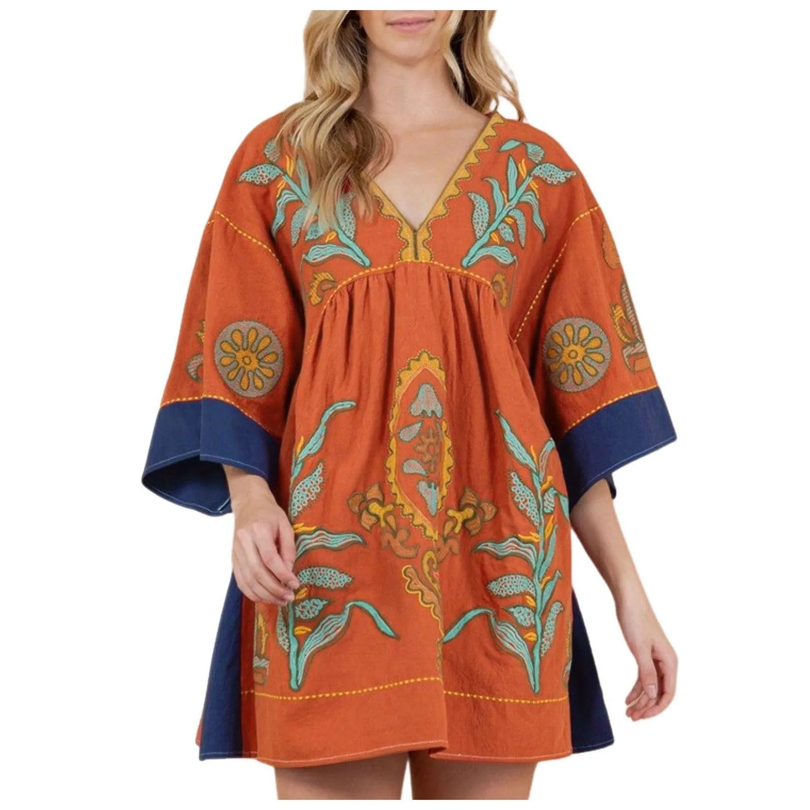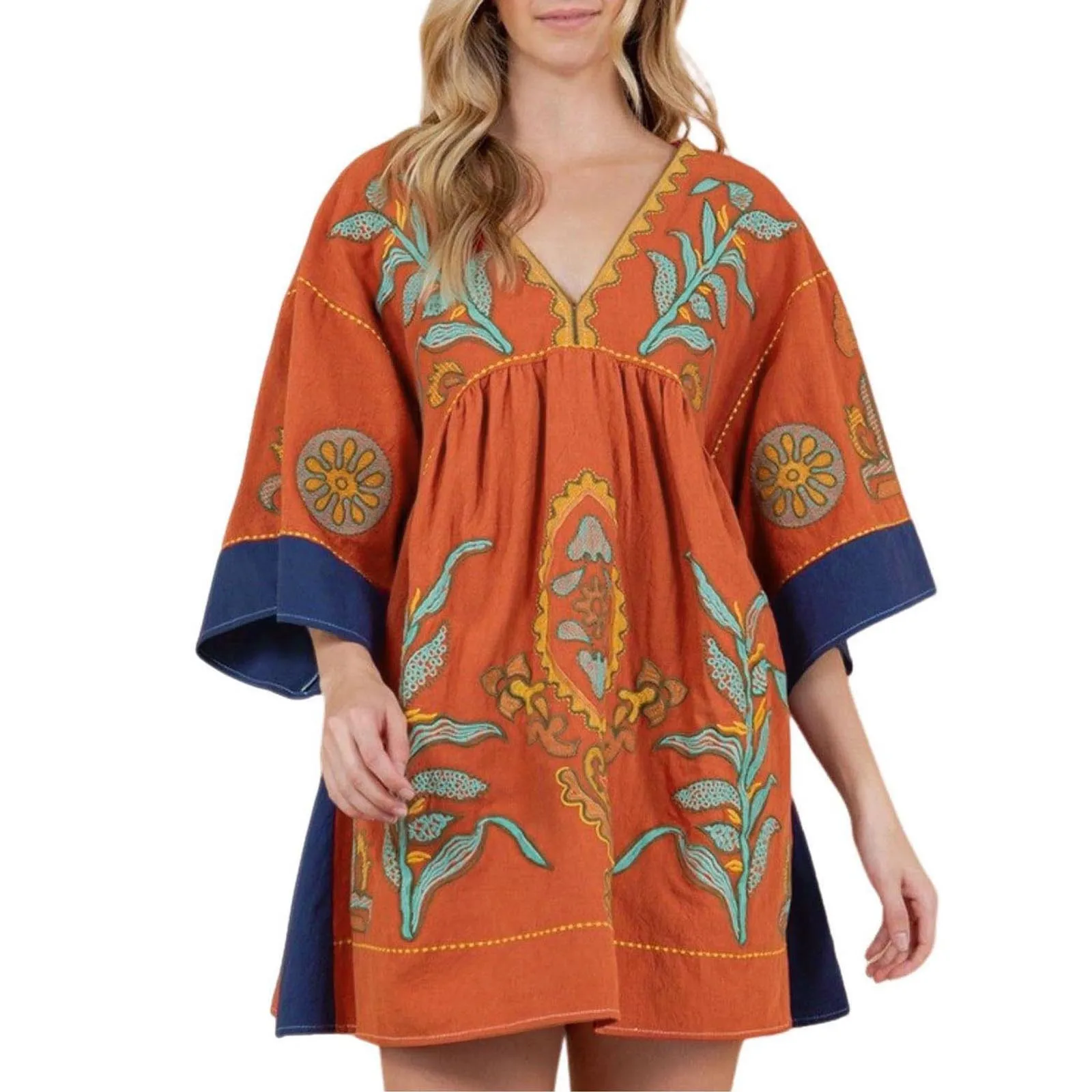Dress up and have fun with this dress! This eye-catching dress is perfect for any occasion - the long and wide flared sleeves, V-neck, -color embroidered details and loose and flowing fit allow you to dress it up or down for a bohemian vibe! Perfect with your favorite everyday sneakers or stylish cowboy boots!