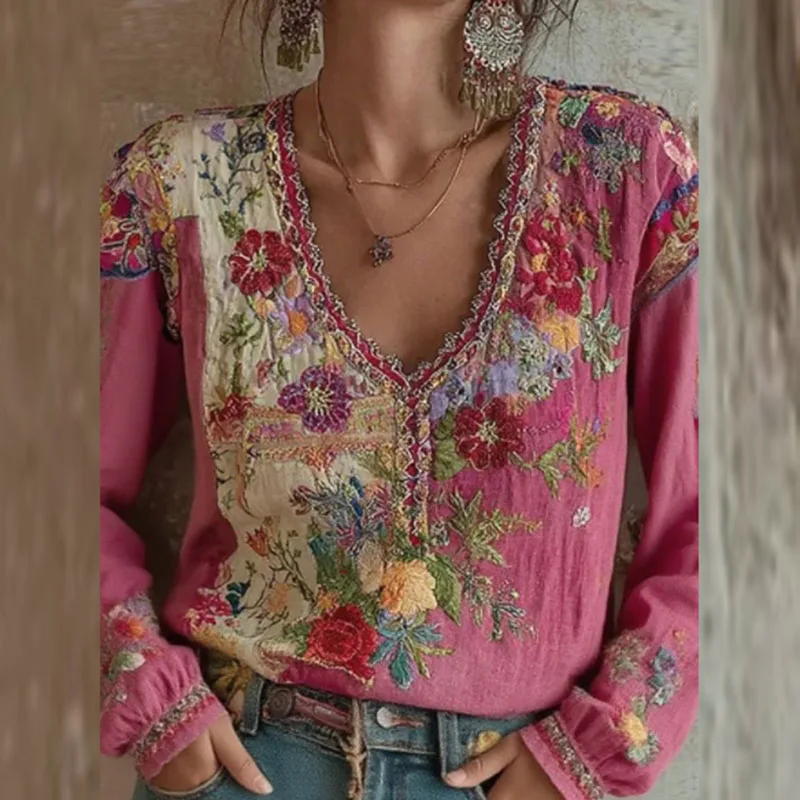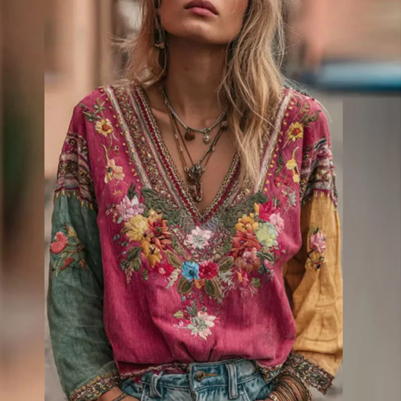 Hippie Vintage Floral Print Woman Clothes Sexy Deep V Neck Hollow Out Blouse Shirts