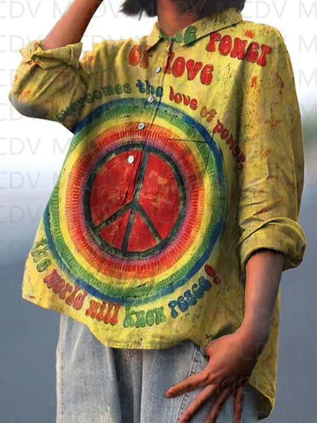 Hippie Vintage Peace And Love Floral Art Print Casual And Linen Shirt Women's Tops