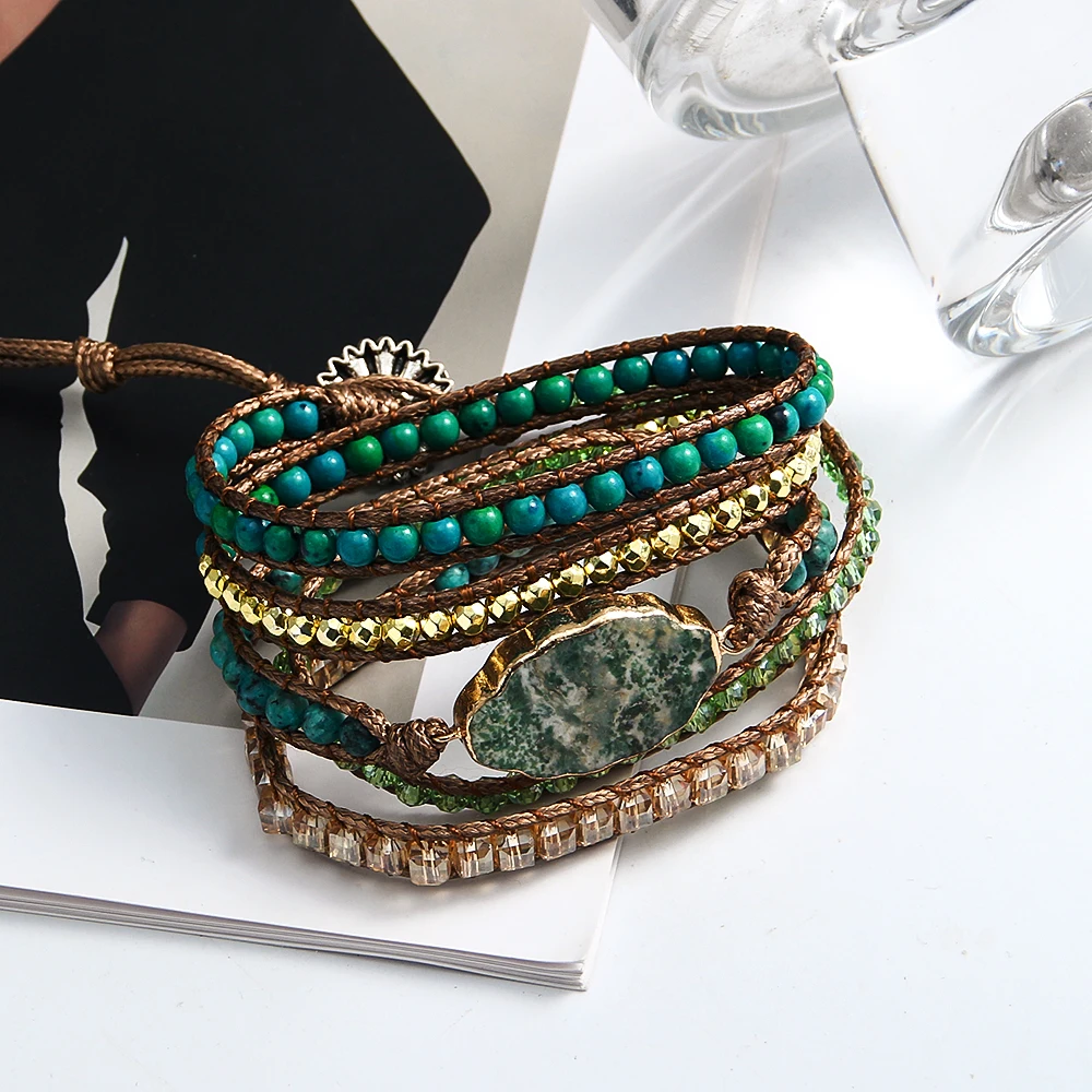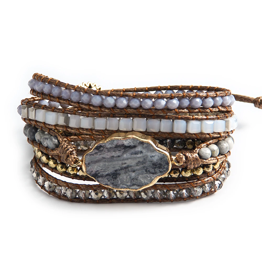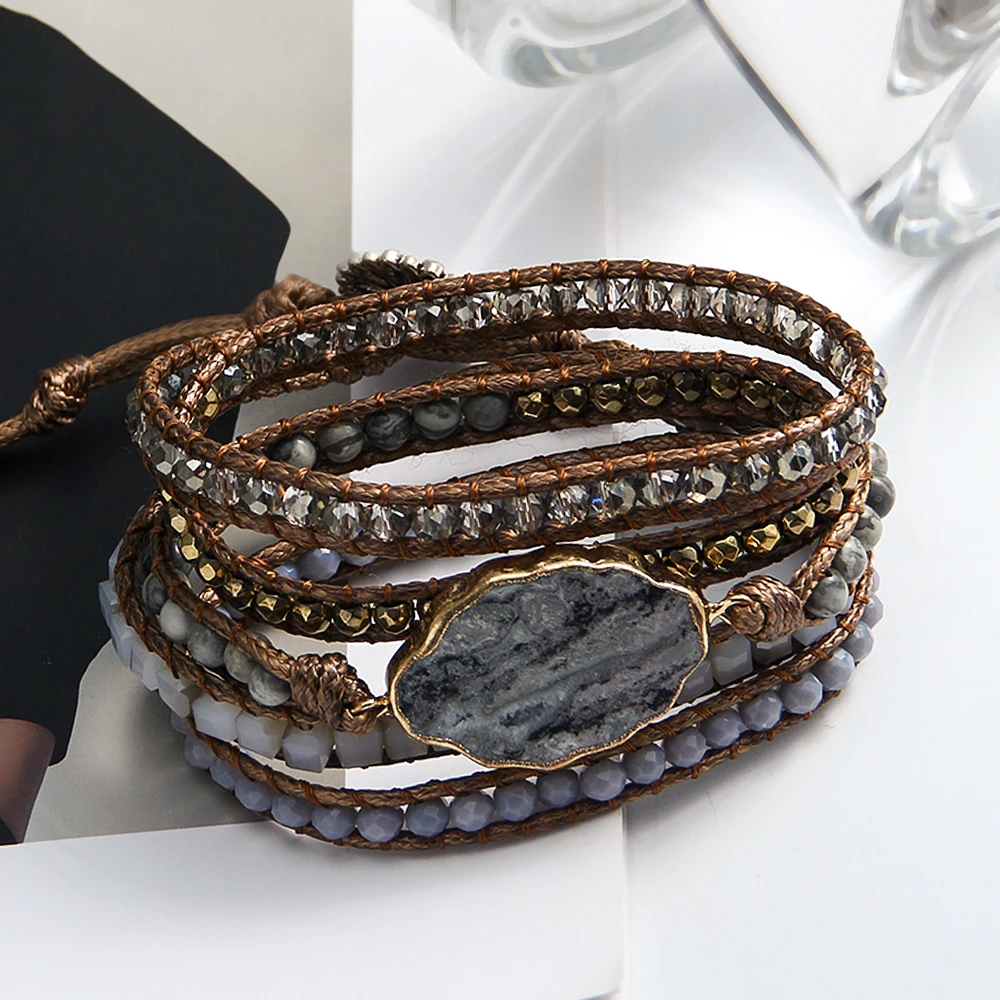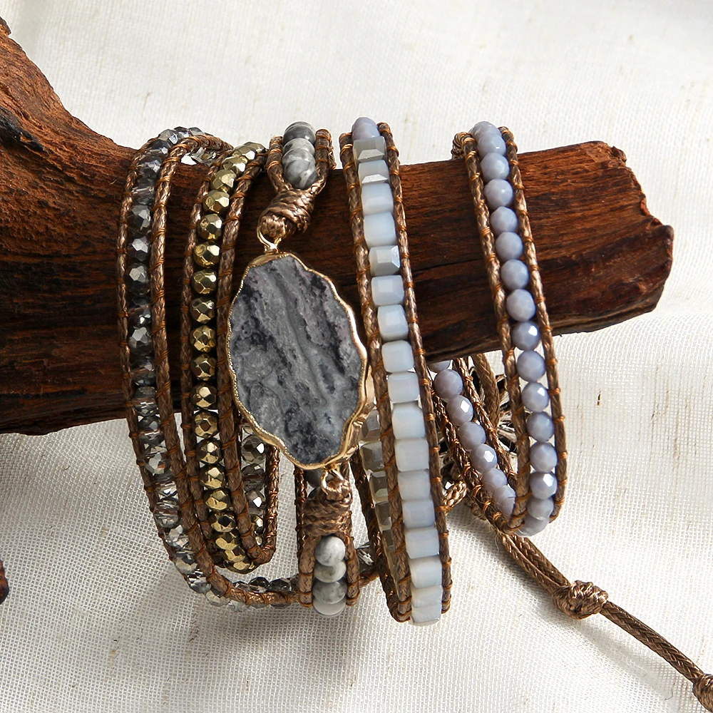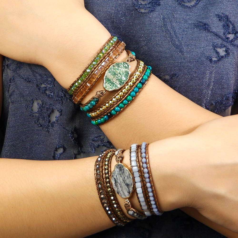 Hippie Wholesale Bohemian Ethnic Style 5 Strands Natural Stone Crystal Glass Handmade Wrap Bracelet