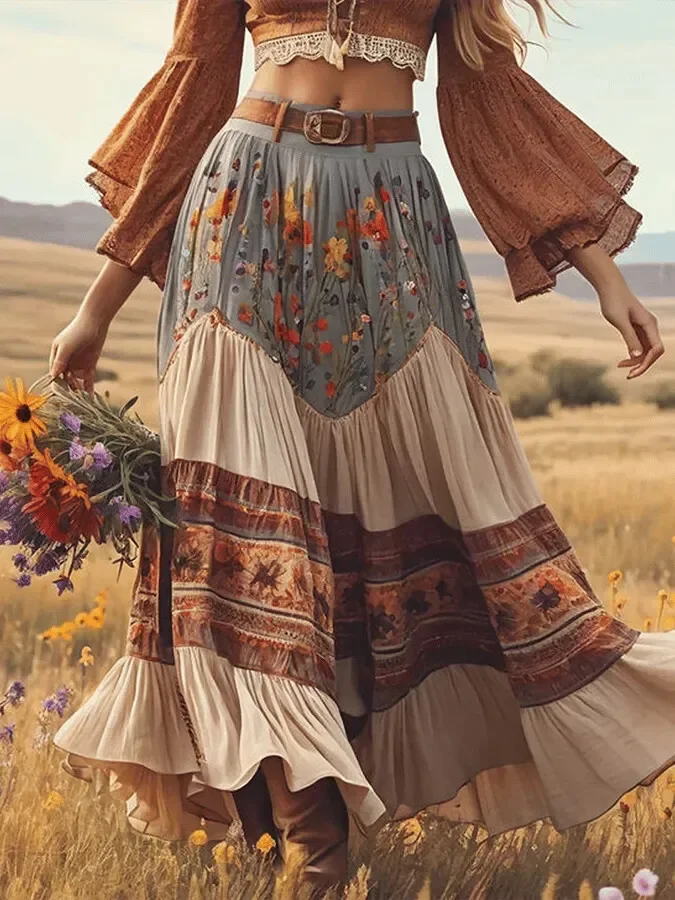 Hippie Women Bohemian Floral Print Color Block Ruffle Hem Skirt